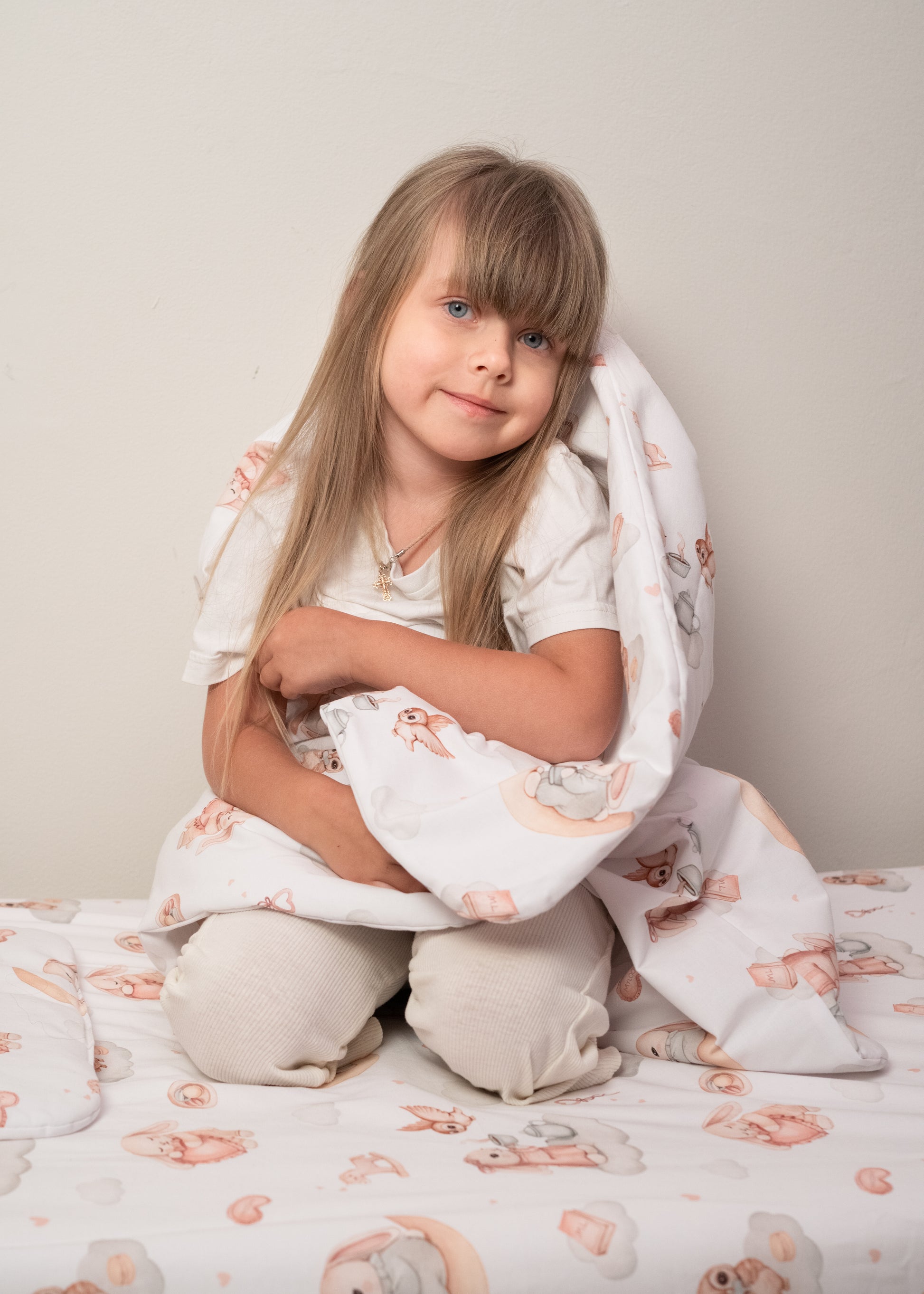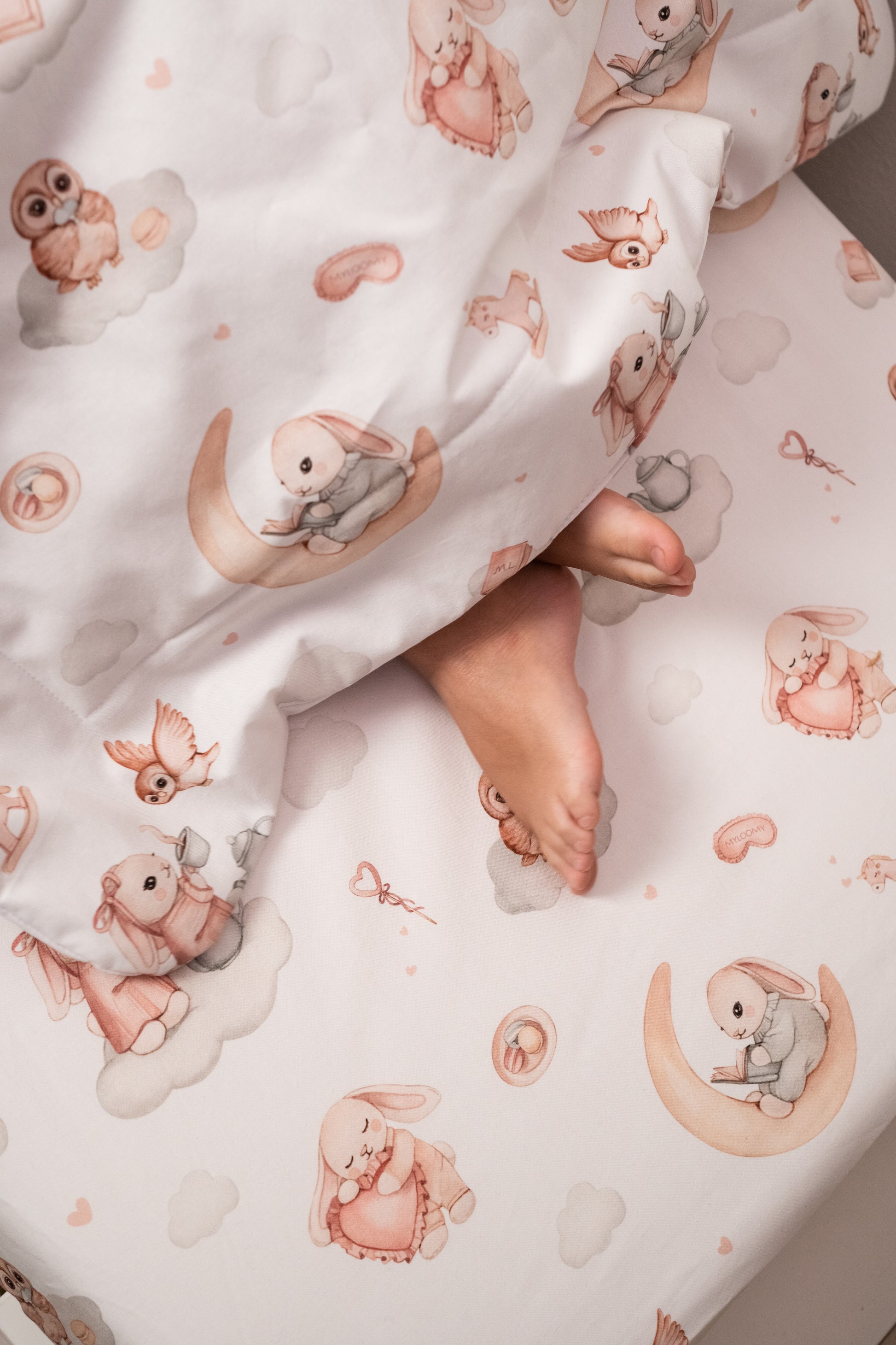 Ексклюзивний принт Moony Dream розроблений талановитими українськими художниками спеціально для MYLOOMY. Цей унікальний дизайн із милими зайчиками, місячними мотивами та м’якими хмарами додає затишку та стилю дитячій кімнаті.